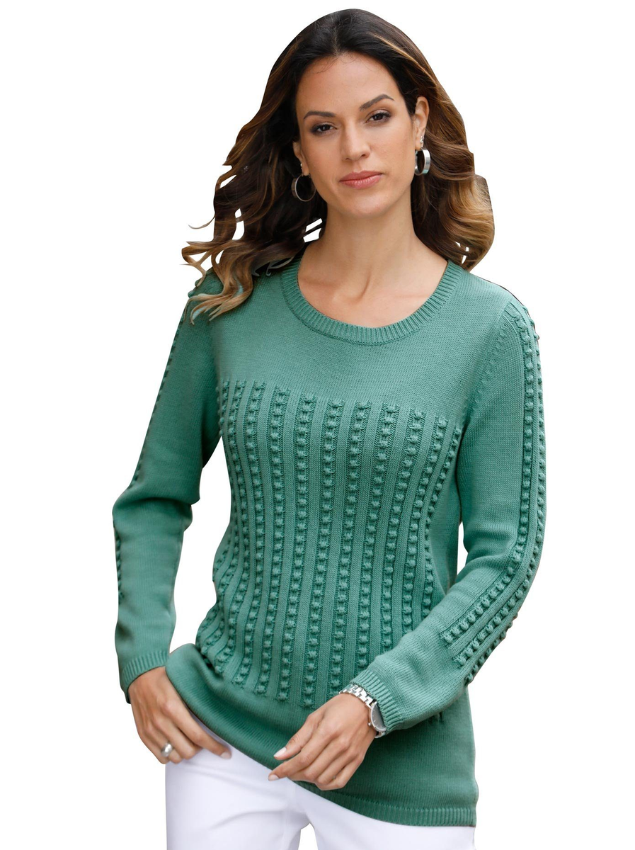 При выборе такой модели нужно учитывать, что пряжи понадобится побольше, чем при обычной лицевой глади. Каждая "шишечка-валик" - это пять петель и шесть рядов вязаного полотна, а их в свитере очень много.