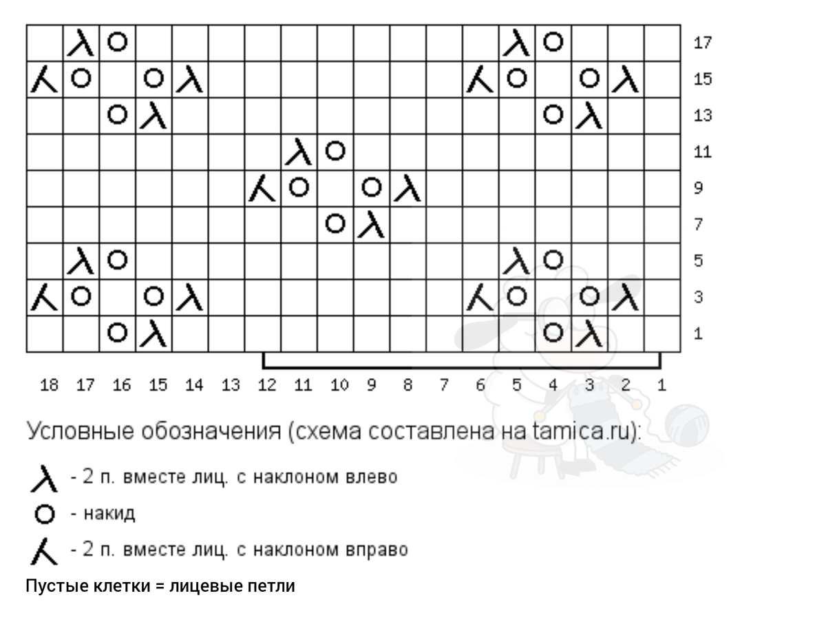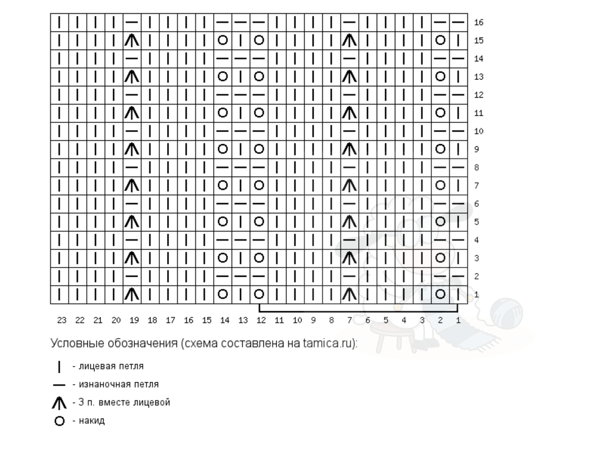 На схеме основного узора указаны только лицевые (нечётные) ряды. В изнаночных рядах все петли вязать изнаночными, накиды тоже.