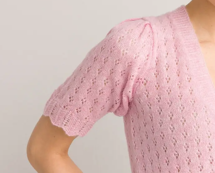 Втачной рукав, V-образный вырез горловины, обшитые трикотажем большие пуговицы — и ненавязчивый узор по всей поверхности.