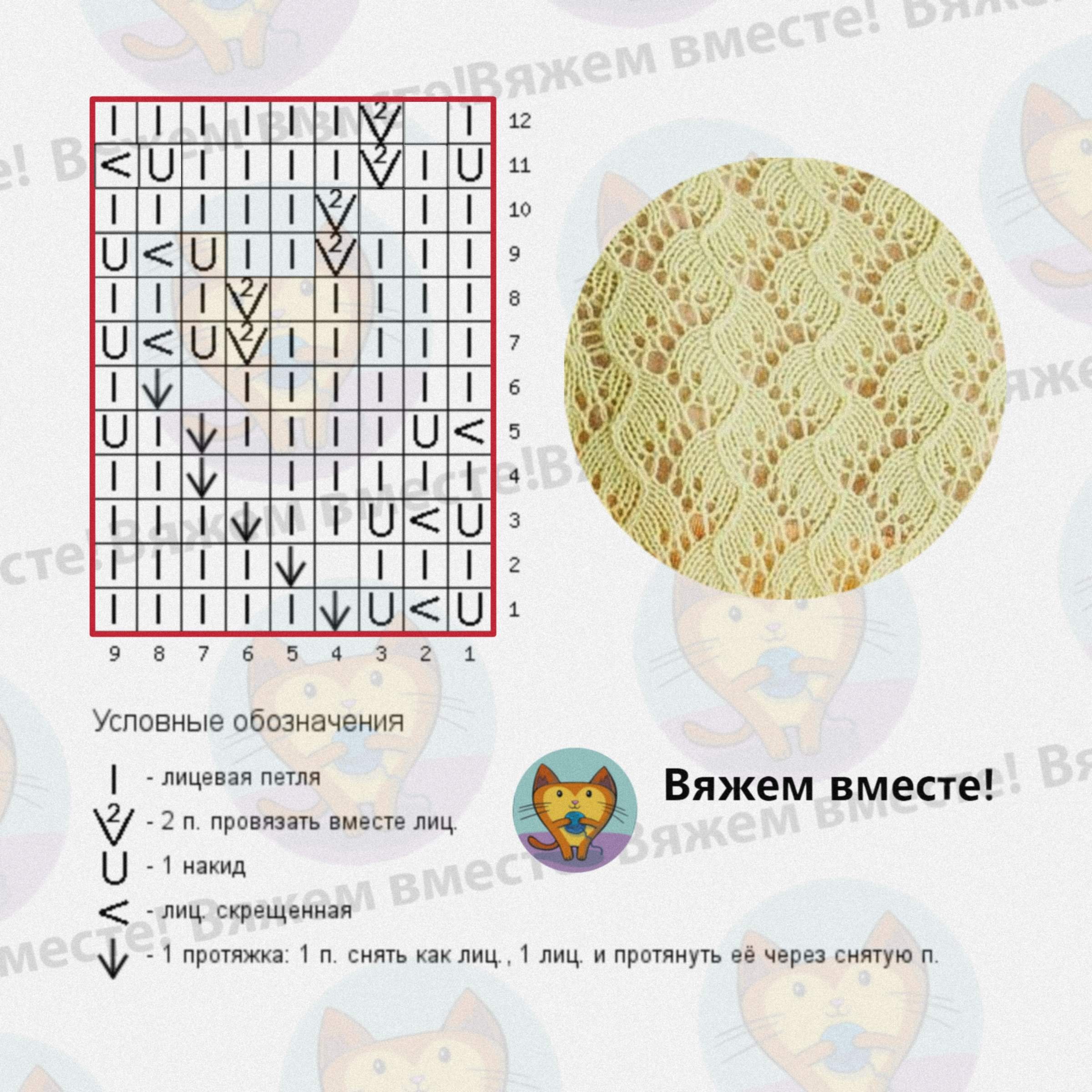 Раппорт узора состоит из 8 (да-да) петель и 12 рядов. Пустая клетка — отсутствие петли. ❗На схеме петли красной рамки пронумерованы 9, но количество набранных на спицы петель должно быть кратно 8. Накид в первом ряду не компенсируется убавлением.