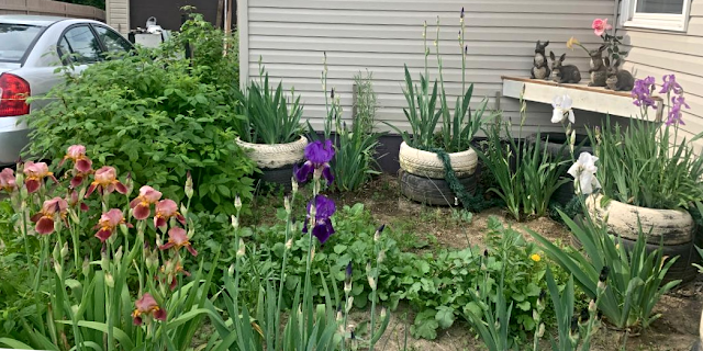 Двойные шины-это не просто так. Там, в углу дома,- немного сыровато для ирисов. Вот я их и решила приподнять от земли на 50 см, чтоб им было посуше и получше; и земельку хорошую,плодородную подсыпала в колёса. Им теперь хорошо, осталось только шины подкрасить;пока руки не дошли...