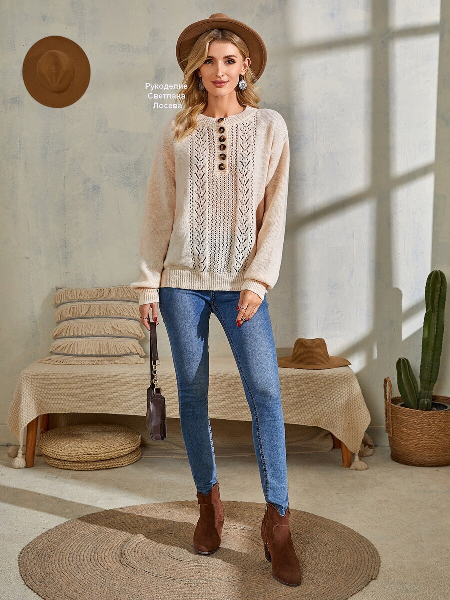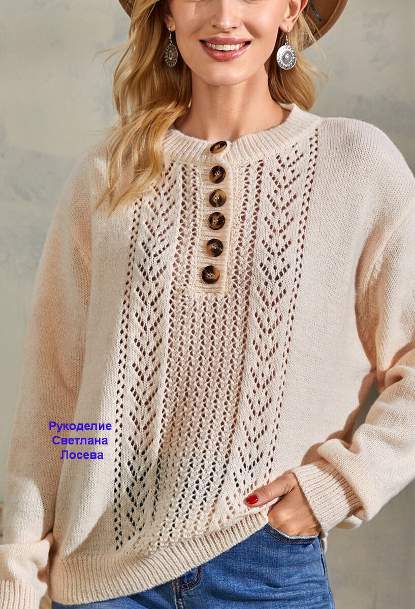 Дорогие мастерицы! Предлагаю вашему вниманию модный джемпер с мелким ажуром в центре в стиле "воротник поло". Да, воротника нет. Упрощенный вариант.
