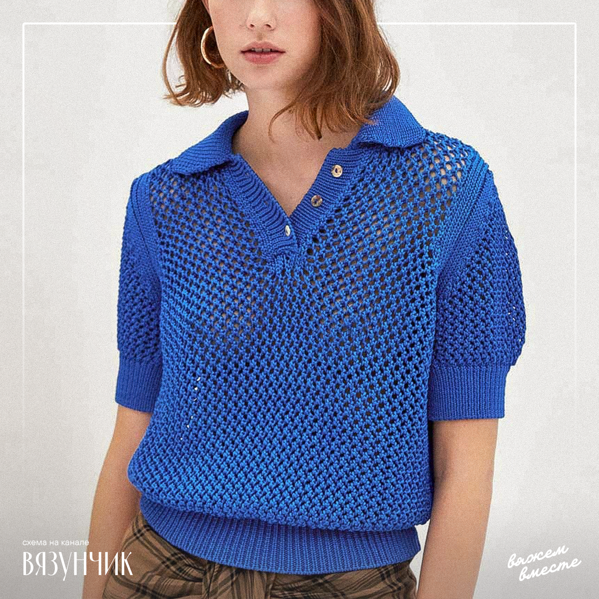 Насколько мне удалось рассмотреть, поло вяжется прямо до пройм, далее вывязывается окат и вырез горловины. Спереди — прямоугольный + полукруг, сзади — полукруг.