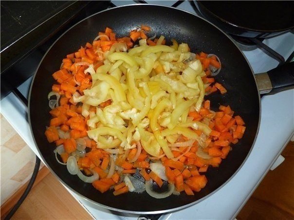 3. Сладкий перец очистить от семян, порезать четвертькольцами, добавить к обжаривающимся овощам.
