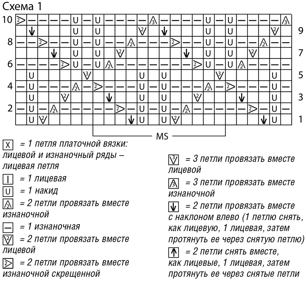 Число петель кратно 12 + 1 + 2 кромочные = вязать согл. схеме 1. На ней даны лицевые и изнаночные ряды. Начать с 1 кром. и петель перед раппортом, раппорт постоянно повторять, закончить петлями после раппорта и 1 кром. Постоянно повторять 1—10-й ряды.