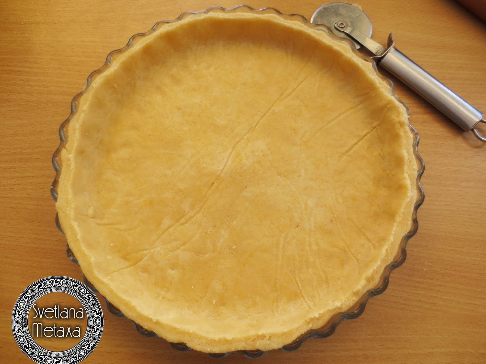 2.Тесто достать из холодильника, немного раскатать и выложить дно и бока формы для пирога, сформировав бортики.