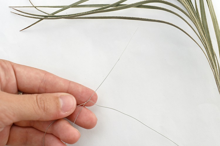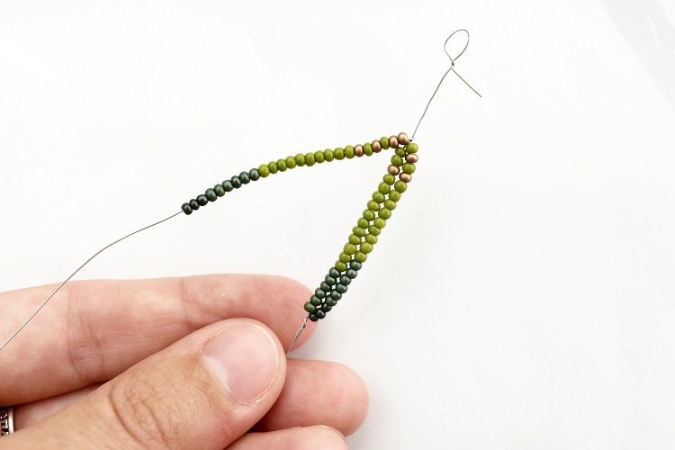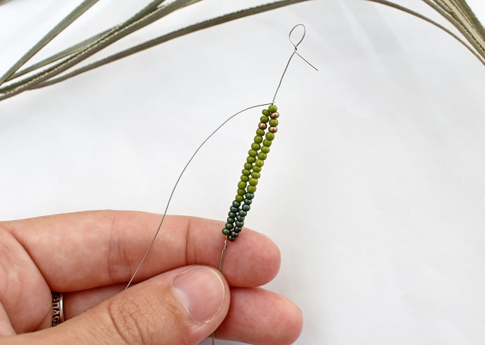 На короткий конец проволоки нанизываем 20 бисеринок и делаем временную петельку.