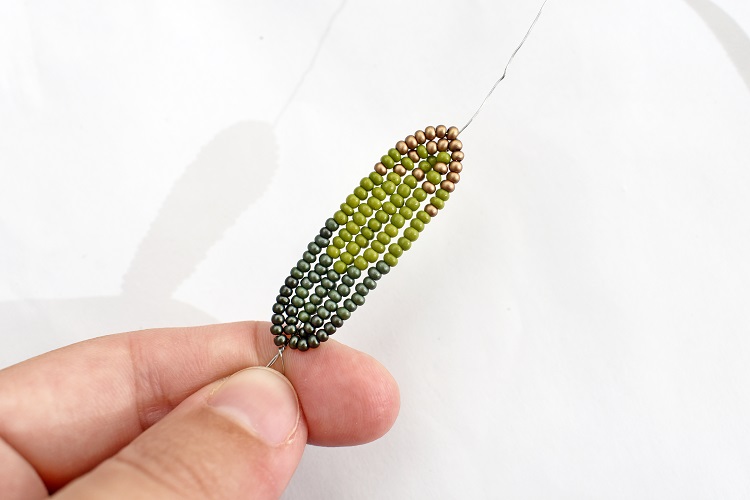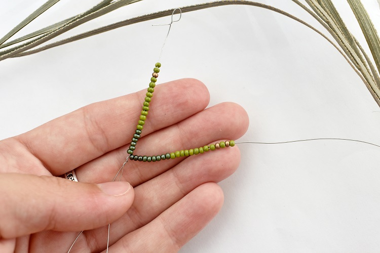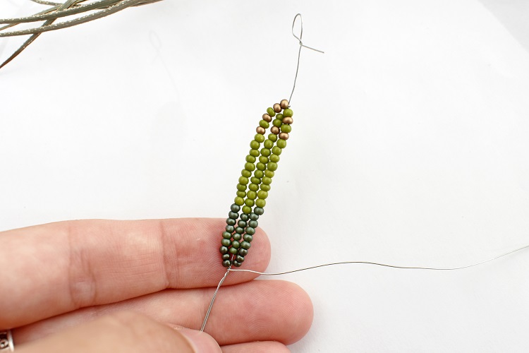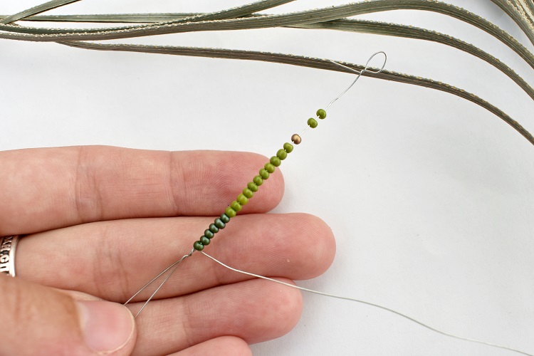 На рабочий конец проволоки нанизываем необходимое количество бисера, чтобы хватило сделать оборот вокруг оси (смотрим фото).