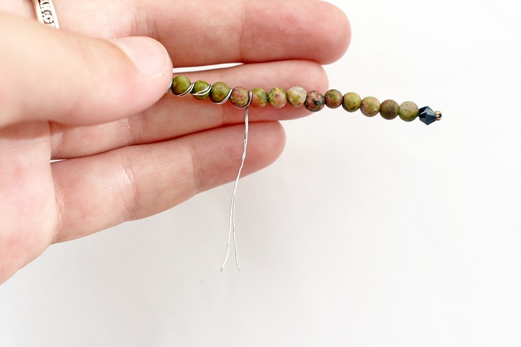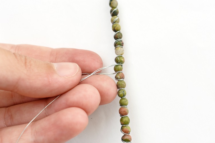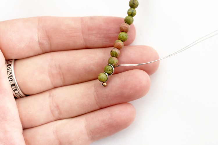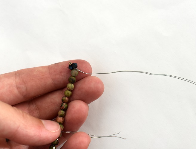 Дойдя до середины останавливаемся. Отрезаем снова проволоку и аккуратно крепим возле первой бусины унакита (смотрим фото).
