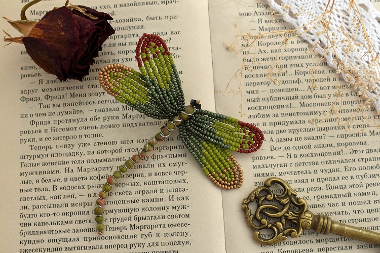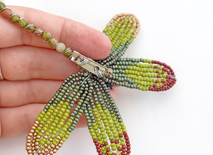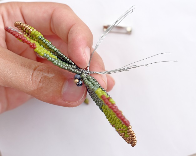 Проходим до середины тельца стрекозы, делая витки между бусинами.