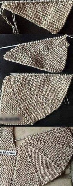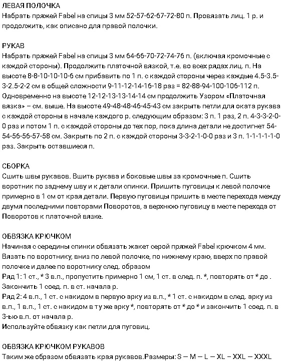 Приталенный жакет связан спицами платочной вязкой. Жакет выполнен в классическом стиле. Края жакета обвязаны крючком, волнообразным узором. Жакет имеет небольшой цельновязанный воротник "шалька".