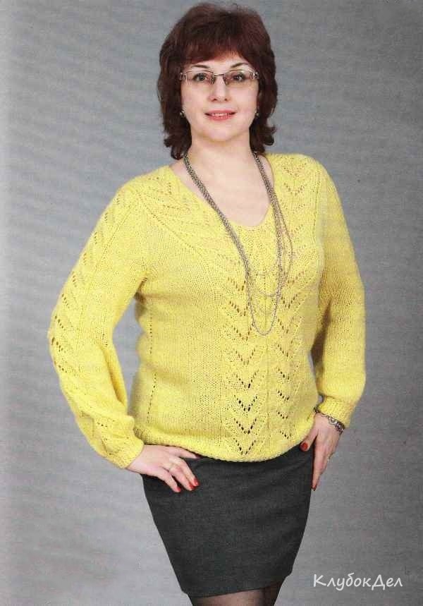Желтый пуловер спицами для женщин - яркая модель с V-образным вырезом горловины и ажурным узором.