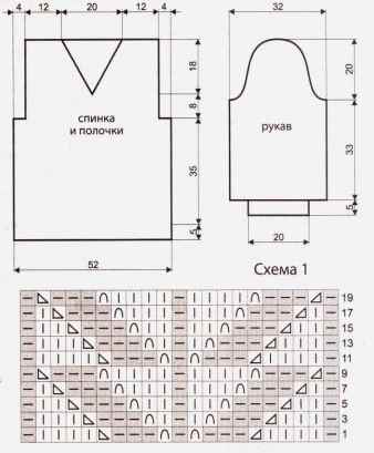 Рукава: набрать 40 п. и вязать 5 см резинкой 1 на 1, в последнем ряду равномерно прибавить 7 п. Продолжить вязание лицевой гладью и ажурным узором по схеме 1, распределить петли узора по середине рукава.