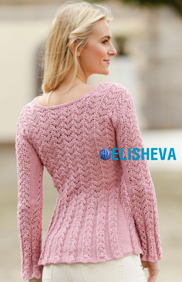 Такую уверенность формирует, во-первых, приталенный силуэт, а, во-вторых, вертикальный рисунок ажурного узора, которым связан весь жакет. Причём вертикальные полосы не только зрительно сужают общие габариты фигуры, они сжимаются на талии и расходятся на бёдрах, подчёркивая естественную конфигурацию.