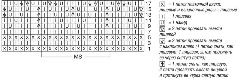 Вязать согл. схеме. На ней даны лицевые ряды. В изнаночных рядах все петли провязывать изнаночными или по схеме, накиды провязывать изнаночными.