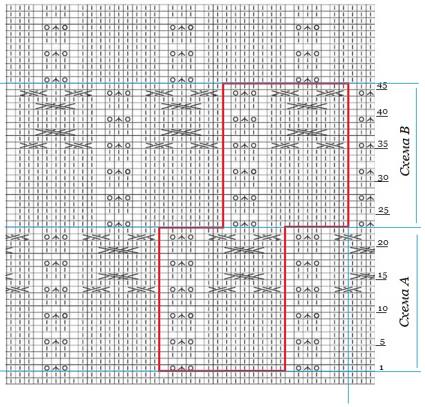 Чтобы выровнять начало вязания, от верхней схемы опустила голубую линию.