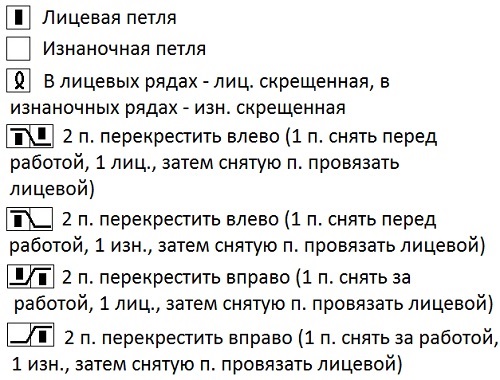 1 ряд: 1 кром., 4 п. перекрестить вправо, 4 п. перекрестить влево, 2 изн., 2 п. перекрестить вправо, 2 изн., 2 п. перекрестить влево, 2 п. перекрестить влево, 5 изн., 4 п. перекрестить вправо, 4 п. перекрестить влево, 1 кром.