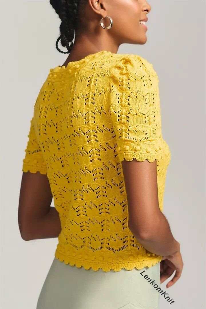Солнечный день! Очень милый вязаный топ на весну. Интересный, неизбитый, женственный с изысканным ажурным и фактурным узором. Цена - $88, состав пряжи - полухлопок (50%и хлопок и 50% акрил).
