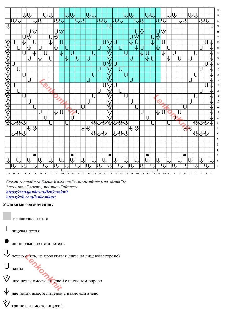 На этом рисунке - схема вязания каймы (сразу после резинки) и основного узора. Узор для этого топа вяжется и в лицевых, и в изнаночных рядах. Поскольку петли видно не очень хорошо, узор не идентичен оригиналу, но максимально на него похож.