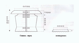 На высоде 31 (31, 34,34) см вяжем пройму. Для этого убавляем с двух сторон в каждом 2-и ряду: 1 раз - 4 петли, 1 раз - 3 петли, 2 раза - 2 петли, 3 раза по 1 петле. В результате получаем 79 (87, 95. 103) петли.