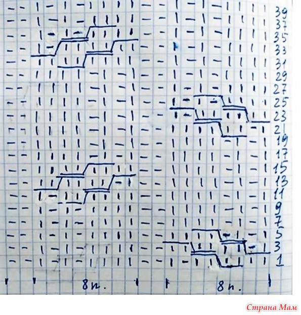 Для формирования скоса с двух сторон одновременно и равномерно делаем прибавки, чередуя в каждом 6 и 7 р. 13х1 п.=68 п./ в каждом 6 р. 14х1 п.=72 п./ в каждом 6 р. 14х1 п.=74 п.