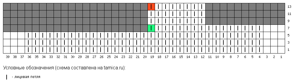 В седьмом ряду довязываем до петли, отмеченной зеленым. На этом месте поворачиваем вязание и начинаем вязать поворотными рядами только 8 петель. Останавливаемся в точке, отмеченной красным.