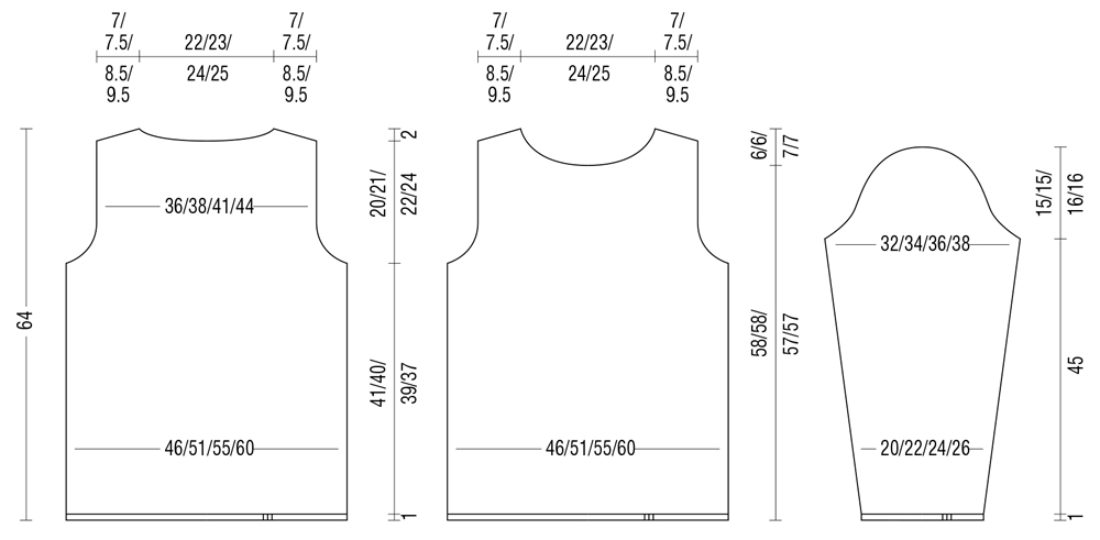 Для пройм через 42 (41) 40 (38) см от начального ряда (измерять в вертикальном положении) закрыть с обеих сторон 1 (1) 2 (2) х 2 п. и убавить 5 (7) 6 (6) х 1 п. = 64 (68) 74 (78) п.