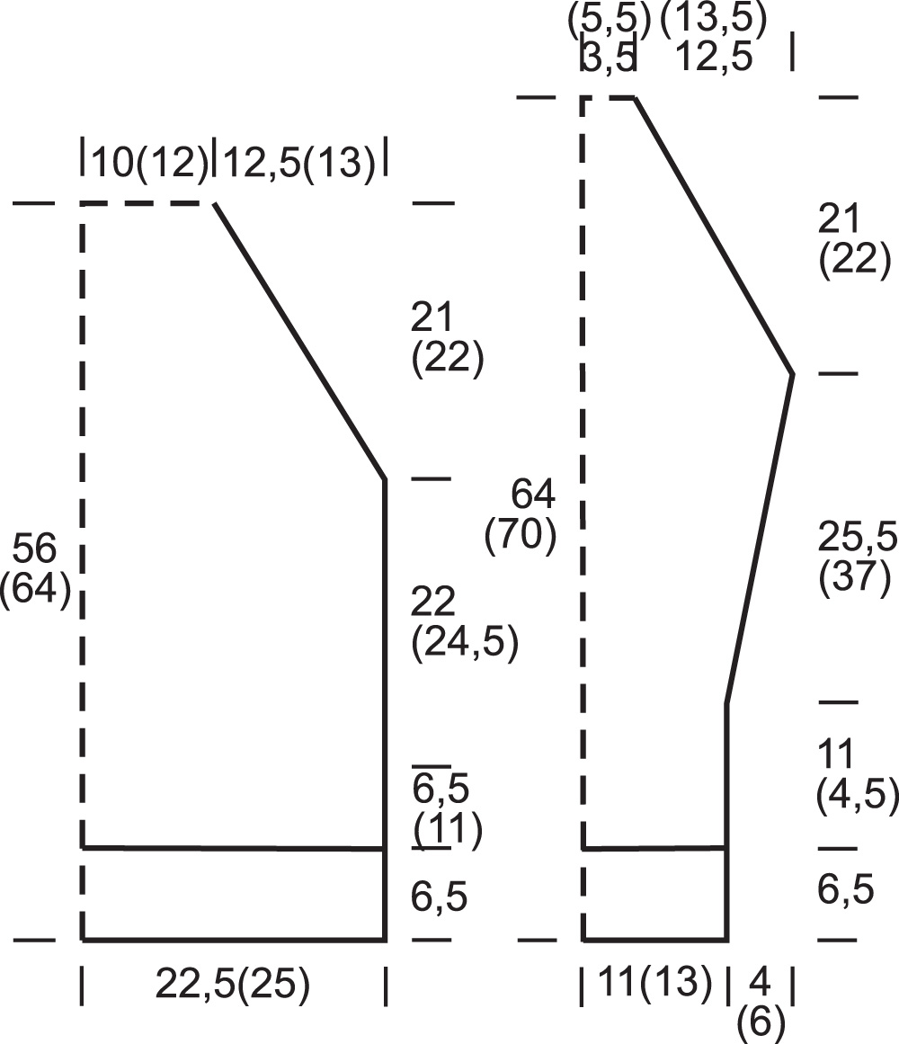 Через 17,5 (11) см от наборного ряда прибавить для скосов с обеих сторон 1 x 1 п., затем в каждом 10-м р. с обеих сторон прибавить 2 (0) x 1 п. и в каждом 8-м р. 2 (7) x 1 п. = 40 (50) п.