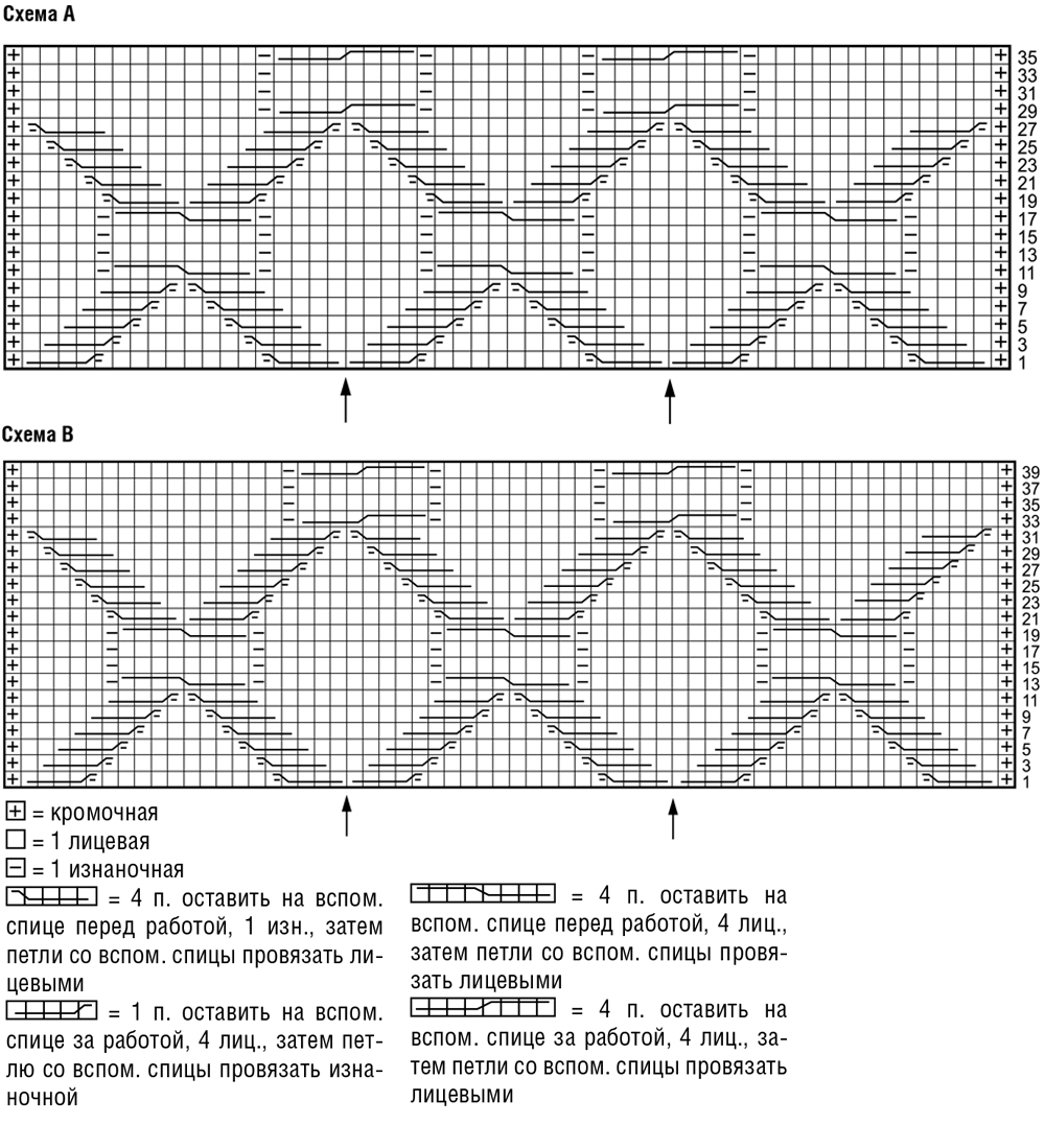 Вязать по схеме A. На ней даны только лицевые ряды, в изнаночных рядах все петли вязать по рисунку. Раппорт из 18 п. постоянно повторять между стрелками. Постоянно повторять 1—36-й ряды.