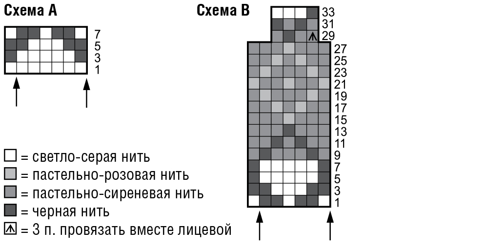 Число петель кратно 6 + 1. Вязать по схемам А и В основным узором. На схемах даны только лицевые ряды и нечетные круговые ряды. В изнаночных рядах и в четных круговых рядах петли продолжать вязать нитями тех цветов, которыми они были связаны ранее. Раппорт из 6 п. постоянно повторять, затем провязать петлю после левой стрелки. В круговых рядах раппорт из 6 петель между стрелками постоянно повторять. С 1-го по 6-й ряд, а также с 1-го по 34-й р./круг.р. выполнить 1 раз.