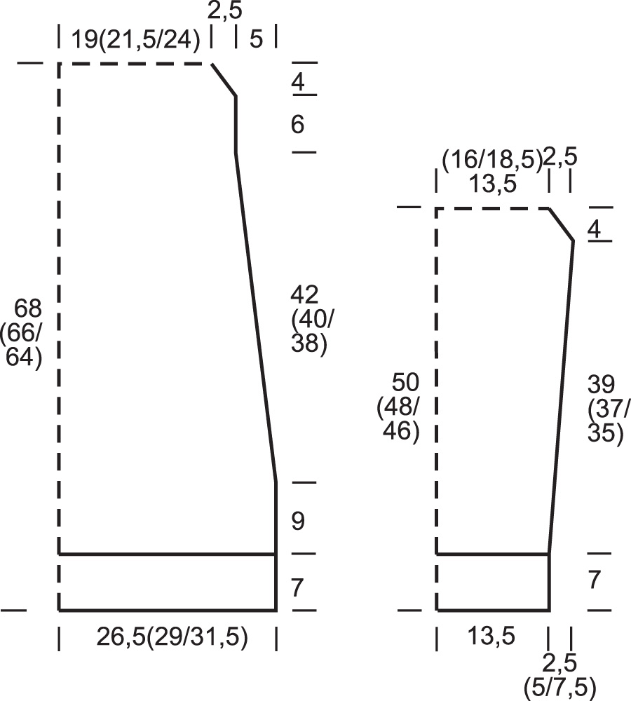 На общей высоте 64 (62/60) см убавить для коротких скосов с обеих сторон 1 x 1 п. и в каждом 2-м р. 2 x 1 п. = 45 (51/57) п.
