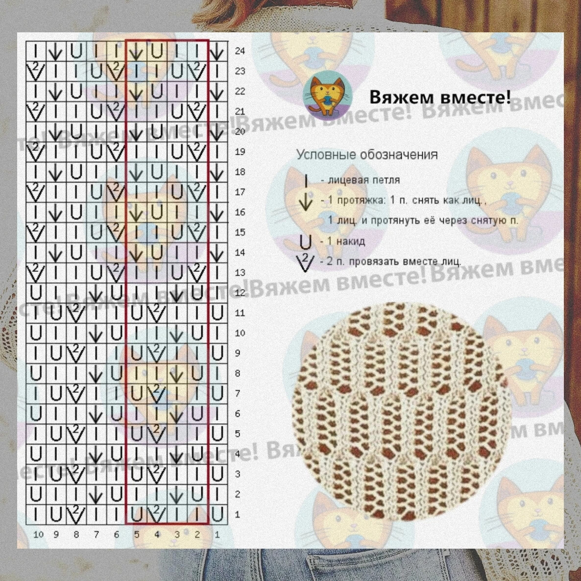 📐Раппорт узора равен 4 петлям по ширине и 24 рядам по высоте.