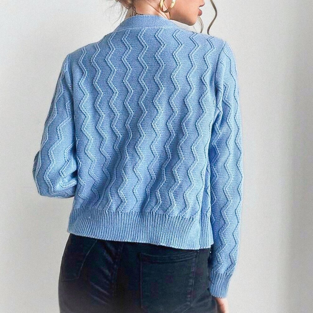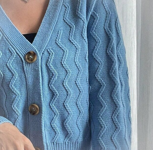 Укороченный кардиган приятного голубого оттенка, выполненный вертикальными зигзагами из лицевых петель на фоне изнаночной глади.