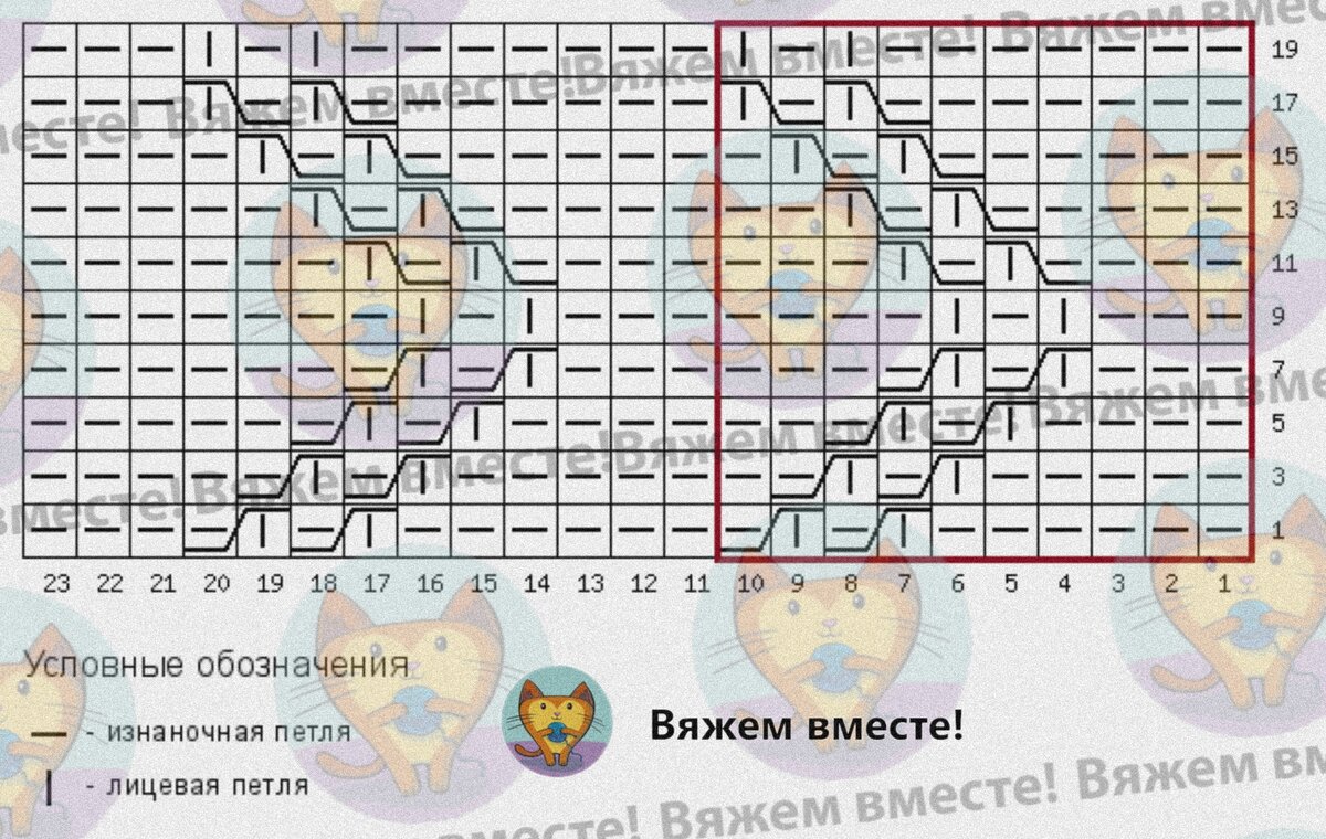 Один раппорт узора равен 10 петлям по ширине и 20 рядам по высоте, выделен красной рамкой.