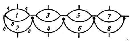 Конец дуги 2 присоединить к основанию кольца 1 обеими нитками. Перевернуть, сплести дугу 3, нить от кольца – рабочая. Не переворачивая, сплести кольцо 4, так же как кольцо 1. Дугу 5 делать как дугу 2. Перевернуть, выполнить дугу 6, так же как дугу 3, присоединяя за боковое пико дуги 2, продолжить далее.