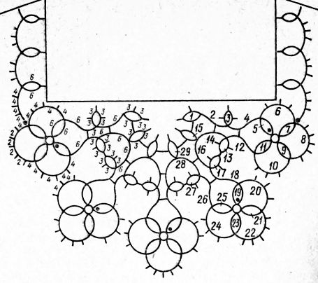 На схеме видно как тесьма разделена осевой линией. Промежуток между верхней и нижней дугами, от осевой линии, состоит из 4 двойных узлов. Чтобы перейти от верхней дуги к нижней надо после 3-го пико дуги верхней части тесьмы сделать 2 узла.