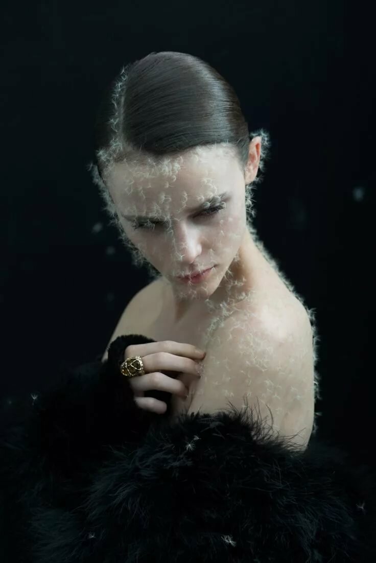 Необычность проекта “Одуванчик” в том, что цветные фотографии только имитируют черно-белое фото. Девушка то выступает из тьмы, то прячется за поэтической вуалью из одуванчика… Она как будто играет двумя противоположностями: тьмой и светом, тяжестью и легкостью. Она — само совершенство. Женщина-куколка, которая через мгновение сбросит с себя темный, тяжелый кокон, сольется с тысячами пушинок одуванчика и улетит…