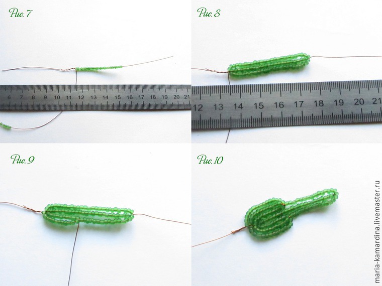 Перед тем, как плести пятый, седьмой и девятый ряды, набираем по одной бисерине на крайние оси.