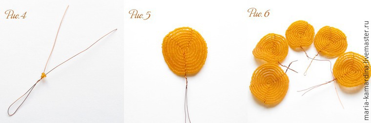 Для маленького лепестка снова набираем 80 сантиметров бисера на проволоку длиной 1 метр, этой длины хватит на два лепестка. Лепесток плетем на 2 осях. Набираем одну бисерину на правую ось, две на левую. Лепесток состоит из 8 рядов оранжевого бисера.