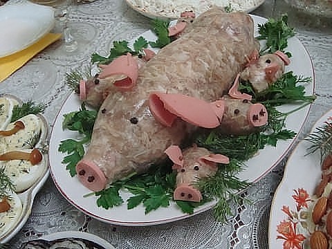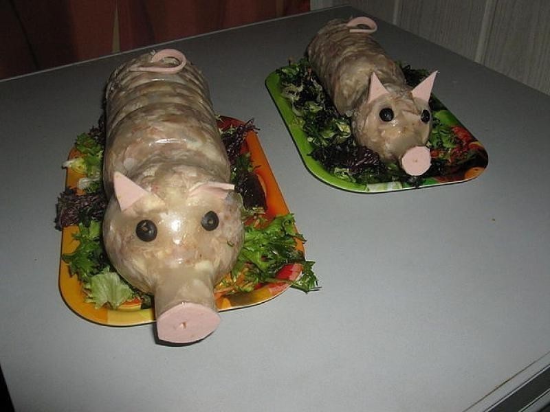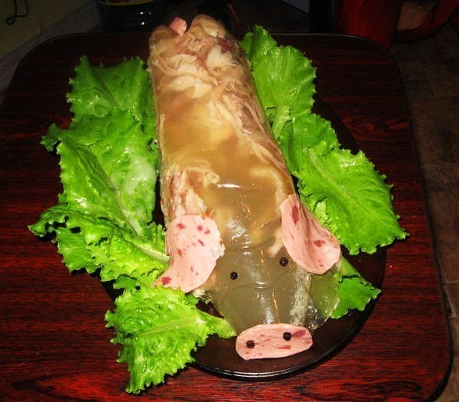 --- Острым тонким ножом разрезаю бутылку с двух сторон, аккуратно достаю «поросенка», выкладываю его на блюдо. Из ветчины вырезаю пятачок, уши и хвостик. Глаза и ноздри делаю из гвоздики. Перед мордочкой можно поставить маленькую емкость с хреном.
