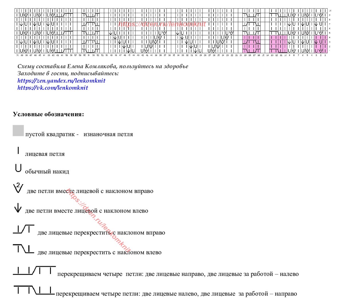 На схеме приведен один раппорт центрального узора в ширину и высоту. А остальные узоры вяжутся только в лицевых рядах, их раппорты выделены розовым цветом.