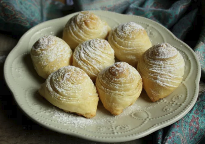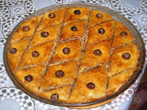 Готовая азербайджанская бадамбура остается светлой, с лёгкой позолотой внизу или на слоях. Подаем, посыпав сахарной пудрой.