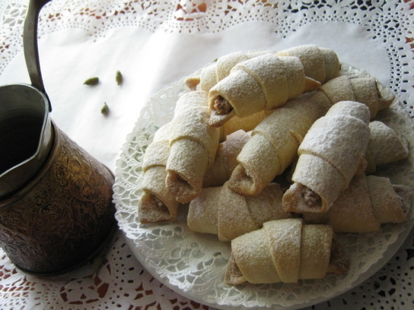 Не переставая мешать, частями всыпать просеянную муку и замесить тесто. Тесто накрыть и поставить в тепло на 1-1,5 часа. Пока тесто подходит, приготовить начинку, смешав измельченные орехи, сахар и кардамон. Готовое тесто тонко раскатать, при помощи выемки или стакана вырезать кружочки, на одну сторону кружочка выложить небольшое количество начинки и защипать. Закрутить гребешок и пинцетом нанести узор в виде елочки.