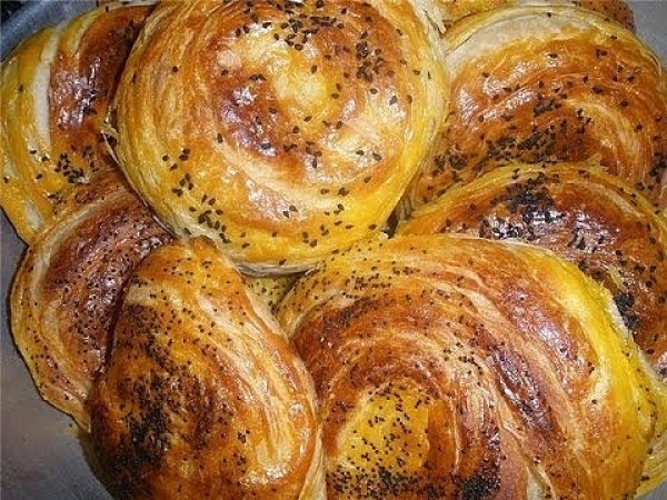 4. Один из них раскатывается в виде тонкого круга и кладется на поднос, сверху тесто смазывается маслом. Потом скалка работает над вторым шариком и им накрывается первый слой. Так же, как и предыдущий, он смазывается жиром, и на нем равномерно распределяется начинка.