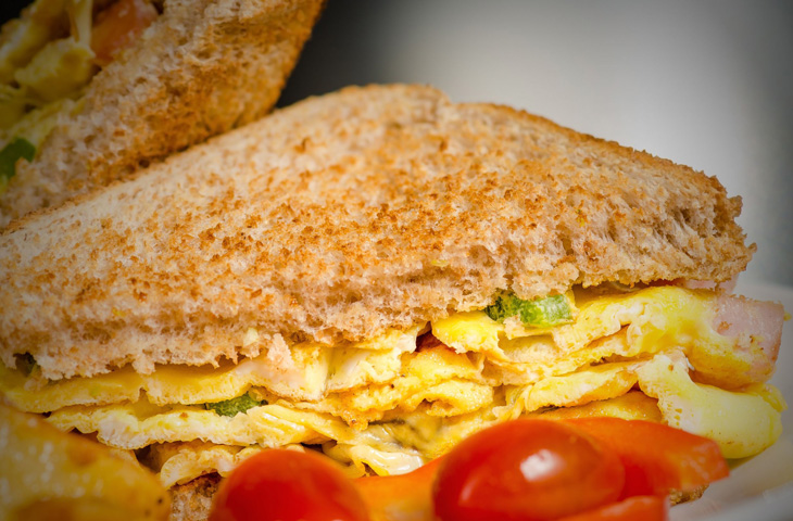 2. Натрите половинки хлеба томатом. Разрежьте омлет на 4 части и положите на хлеб так, чтобы получился сэндвич. Подавайте остывшим до комнатной температуры.