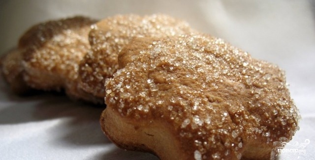 Печенье обмакиваем лицевой стороной в сахар и кладем на смазанный маслом противень (можно застелить бумагой для выпечки).