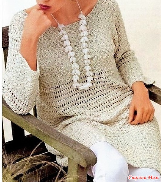 Вам потребуется: пряжа – Mare (40% вискозы, 30% льна, 30% хлопка, 110 м/50 г.) 650 (700) 750 г. бежевого цвета; спицы № 4 и № 4,5; крючок № 3,5-4.