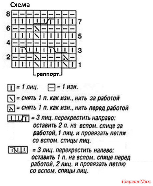 На схеме даны лицевые ряды и изнаночные ряды. Начинать с 1 кром. п. и петель перед раппортом, повторять раппорт, заканчивать петлями после раппорта и 1 кром. п.