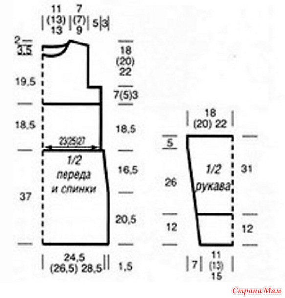 Через 7 см = 22 р. (5 см = 16 р.) 3 см = 10 р. от конца узора В для пройм закрыть с обеих сторон по 12 п. = 83 (91) 99 п.
