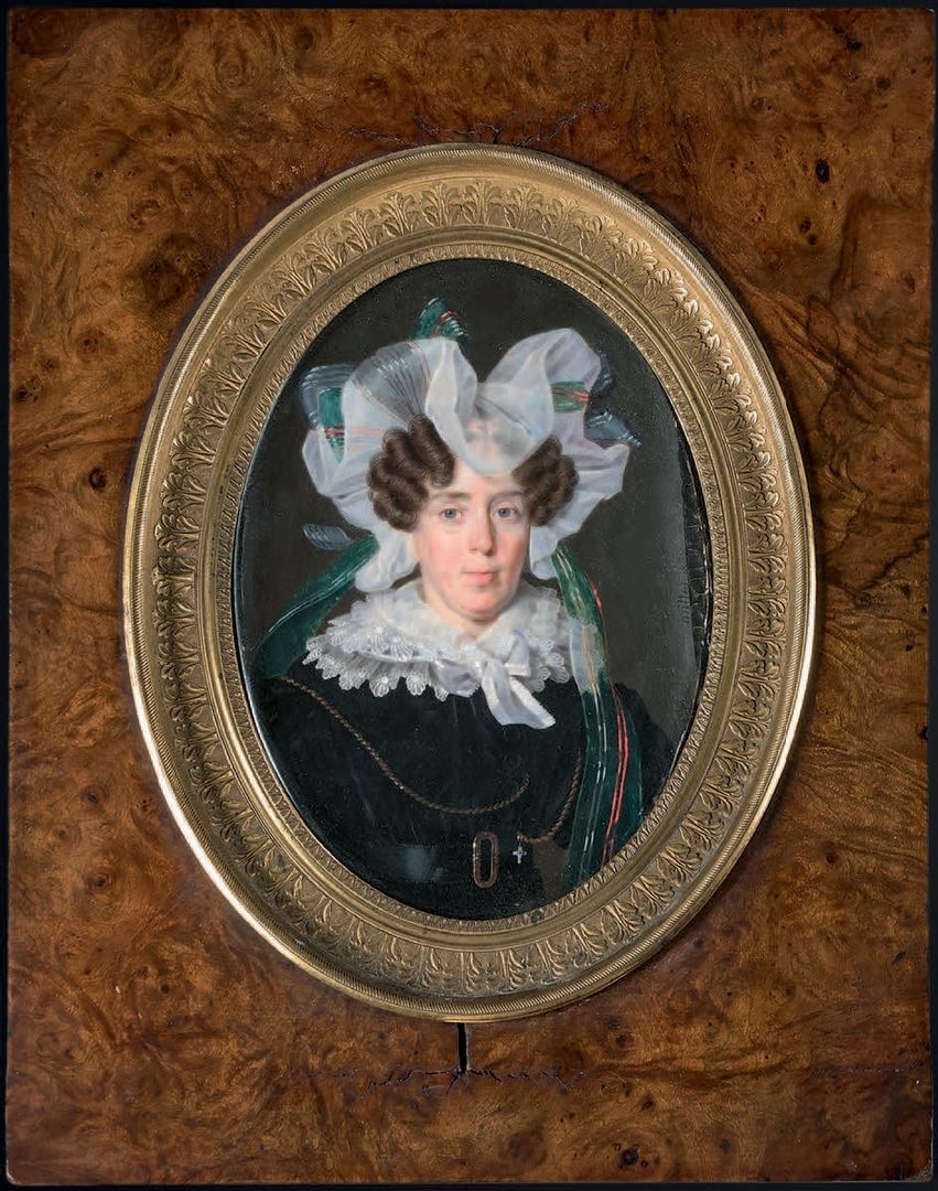 Портрет женщины в чёрном платье с широким воротником и кружевным головным убором, украшенным лентами, 1832